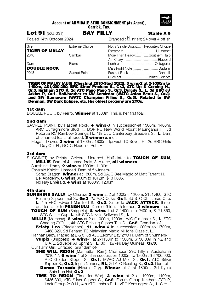 I know this filly well. She is by one of the most exciting young sires in Australia in Tiger Of Malay who is currently sitting second on the Australian First Season Sires List behind only Home Affairs whose yearlings fetched over $30,000,000 at the main four Australian Yearling Sales in 2025.